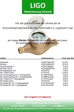 Der Kreisverband Uckermark der Gartenfreunde hat mit der Firma Lindenblatt und Gottzmann (LIGO) für deren Niederlassung in Schwedt für alle Gartenfreunde der Vereine die im Kreisverband Uckermark der Gartenfreunde organisiert sind eine Vereinbarung getroffen. Diese Vereinbarung beinhaltet einen Einkaufsvorteil für alle Gartenfreunde und eine Vorteilsaktion. Diese Aktion ist begrenzt. Siehe Aktionsflyer.